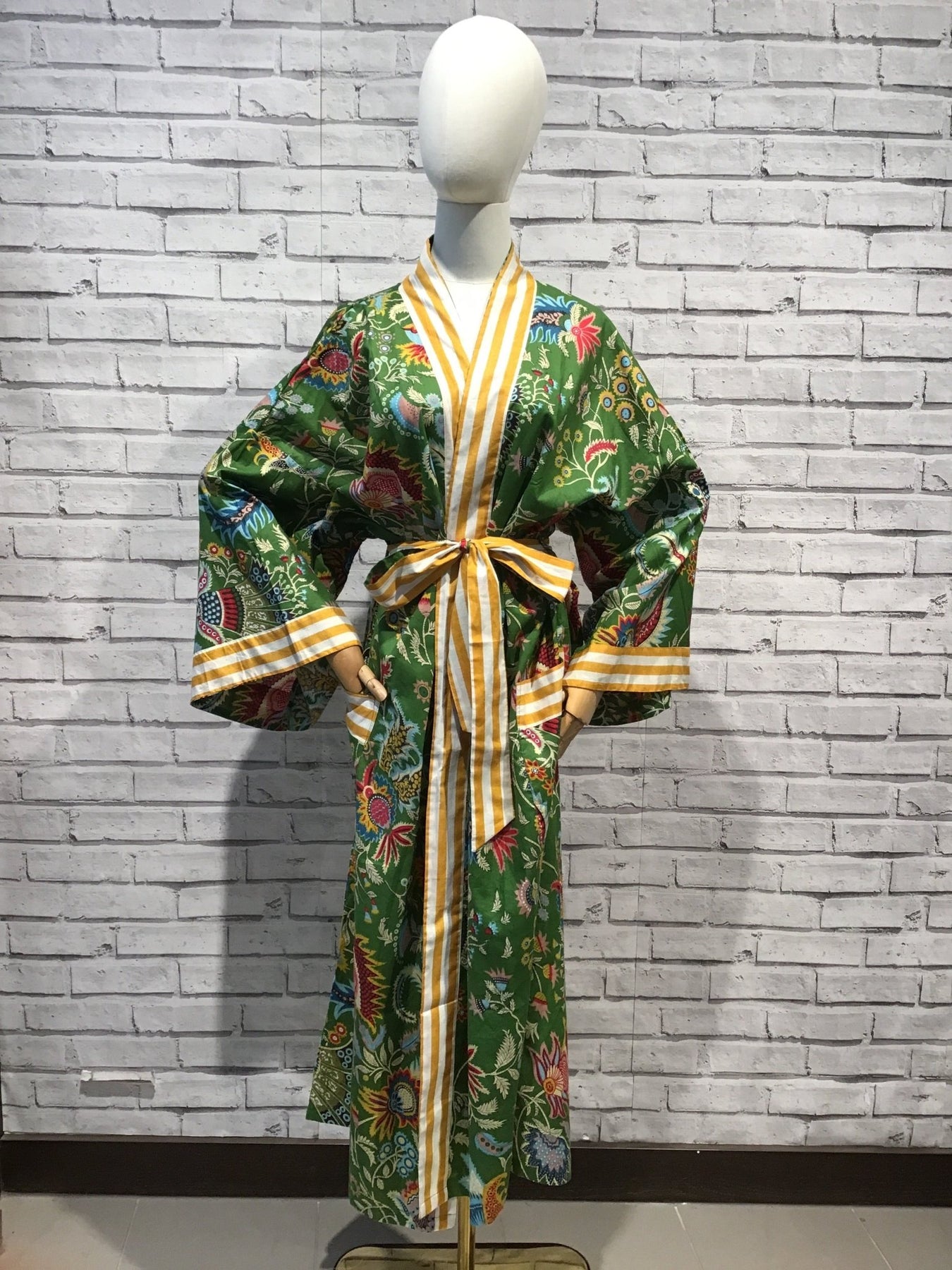 An elegant and stylish hand made block printed 100% organic cotton robe with a wrap tie and 2 large pockets.