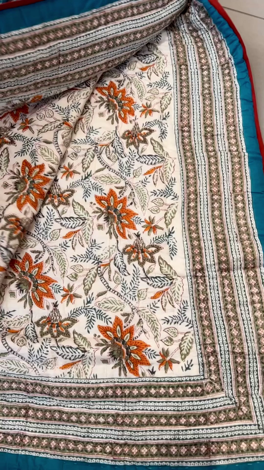 A hand made Rajasthani block printed and hand stitched quilt, filled with a warm puffy cotton filling and enhanced with a beautifully complementary design on the reverse.