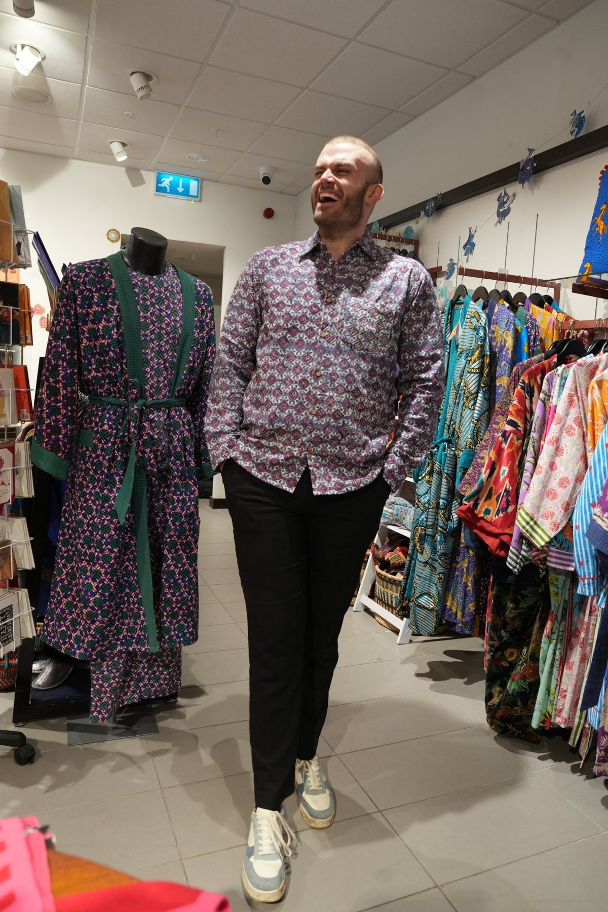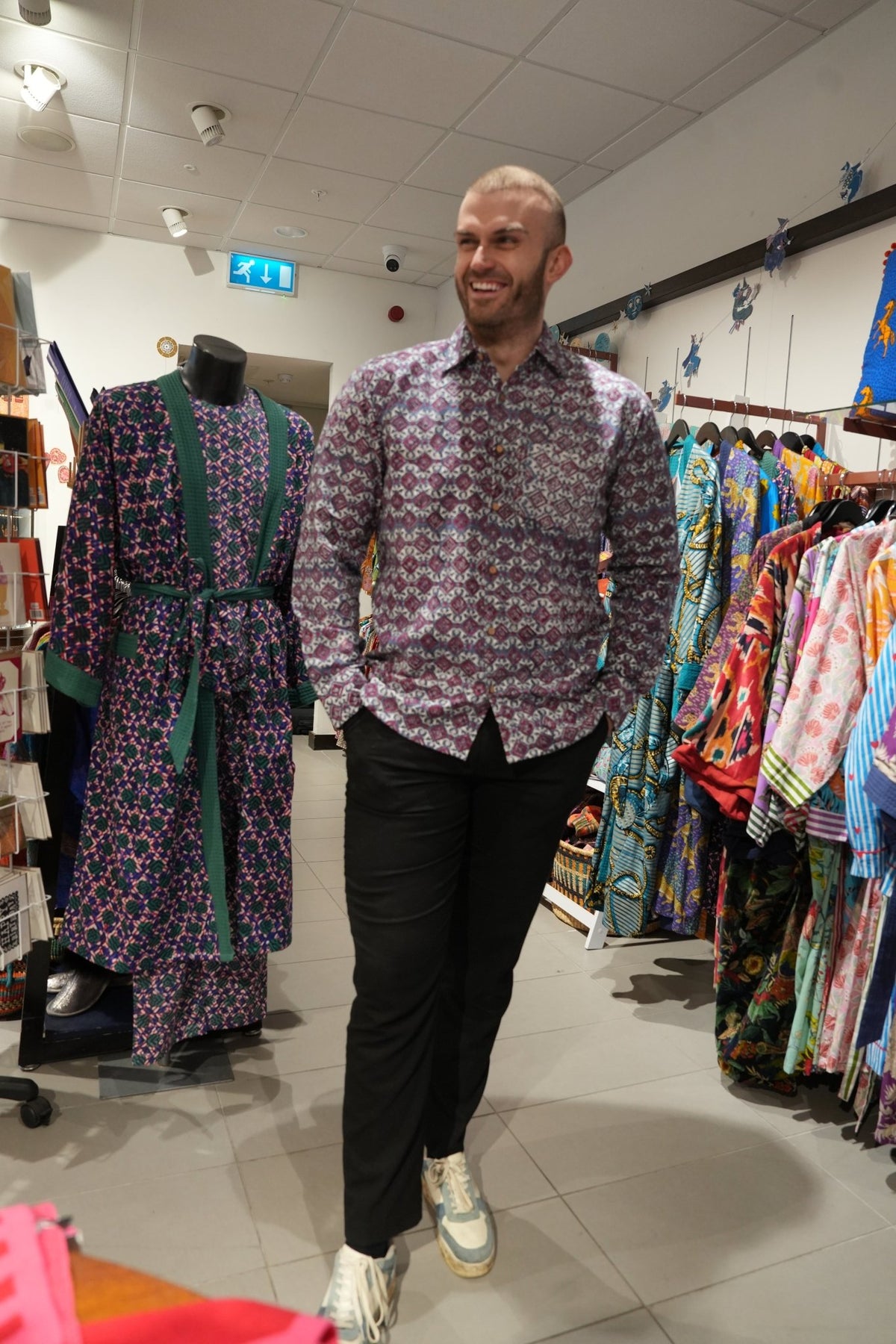 Men's long sleeve shirt, regular fit with a vibrant and unique design. Block print organic cotton Flannel.
