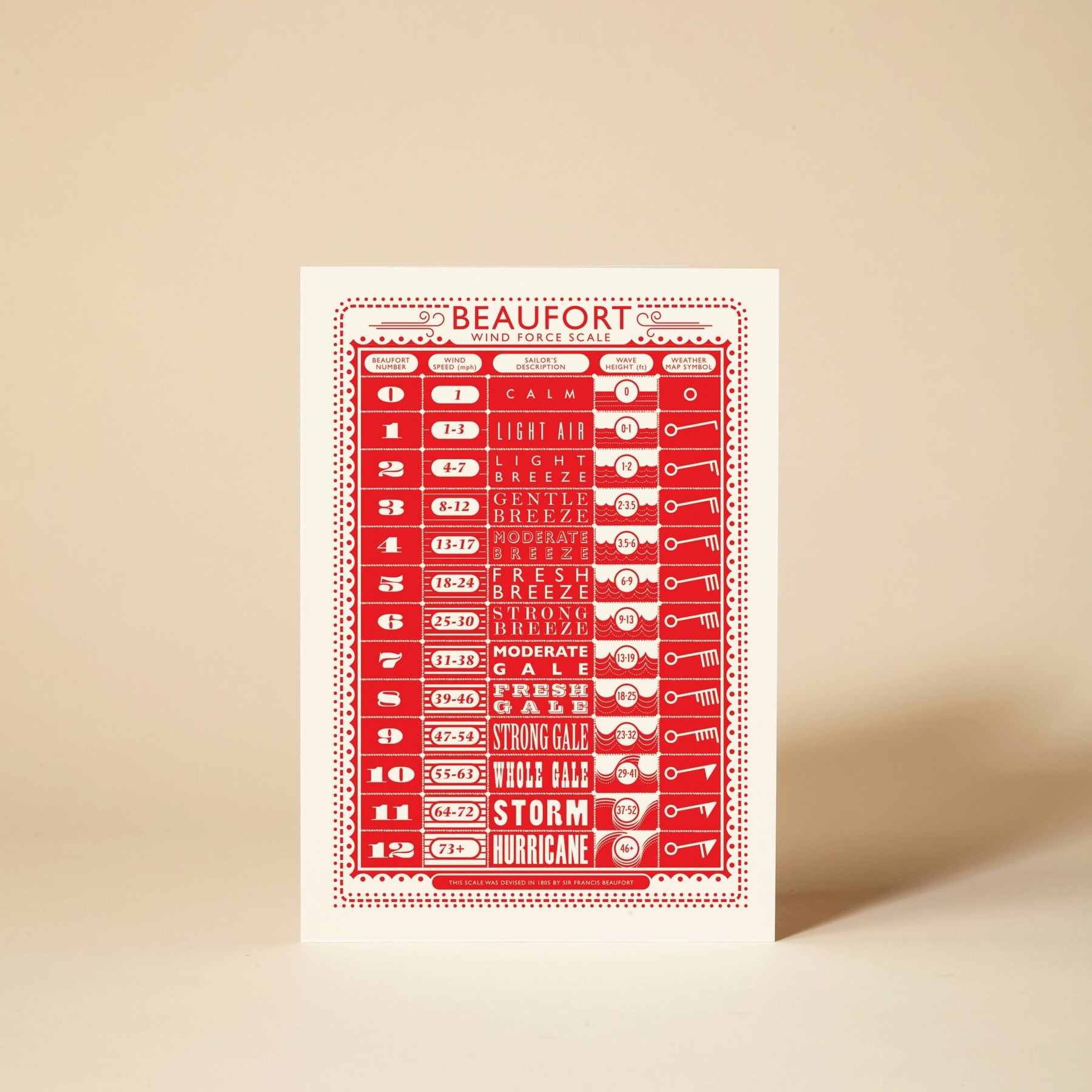 The Beaufort Scale Greeting Card The Beaufort Wind Force Scale- Devised by Sir Francis Beaufort in 1805, is an empirical measure for describing wind intensity based on observed sea conditions. Originally produced as an A3 screen print and now available as a beautiful greeting card perfect for all occasions. 120 x 170mm folded Packaged in a 100% recycled kraft envelope and biodegradable cello bag. Designed and printed in the UK.