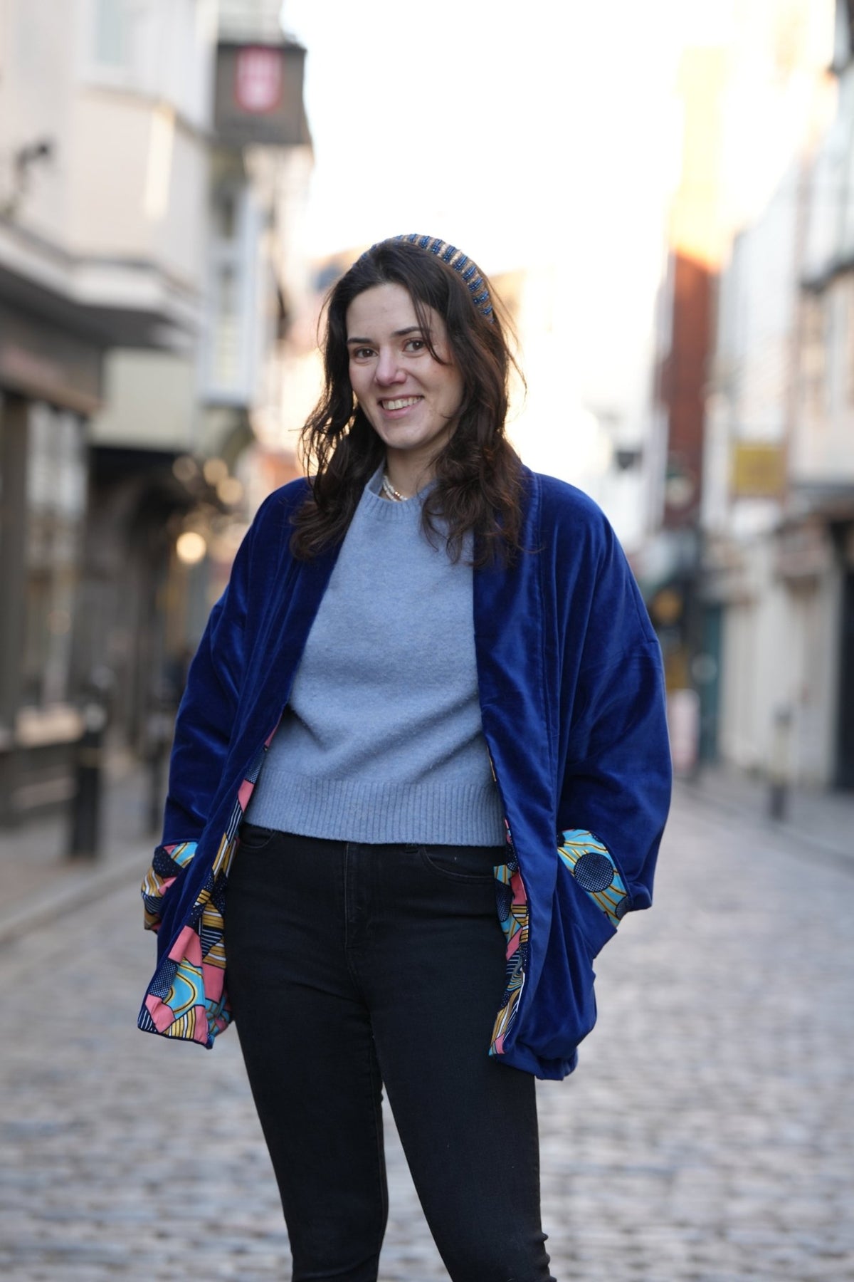 A gorgeous rich royal navy reversible velvet jacket, with a stunning wax printed cotton in tones of turquoise, navy, pink highlighted in metallic gold over print on the flip side.