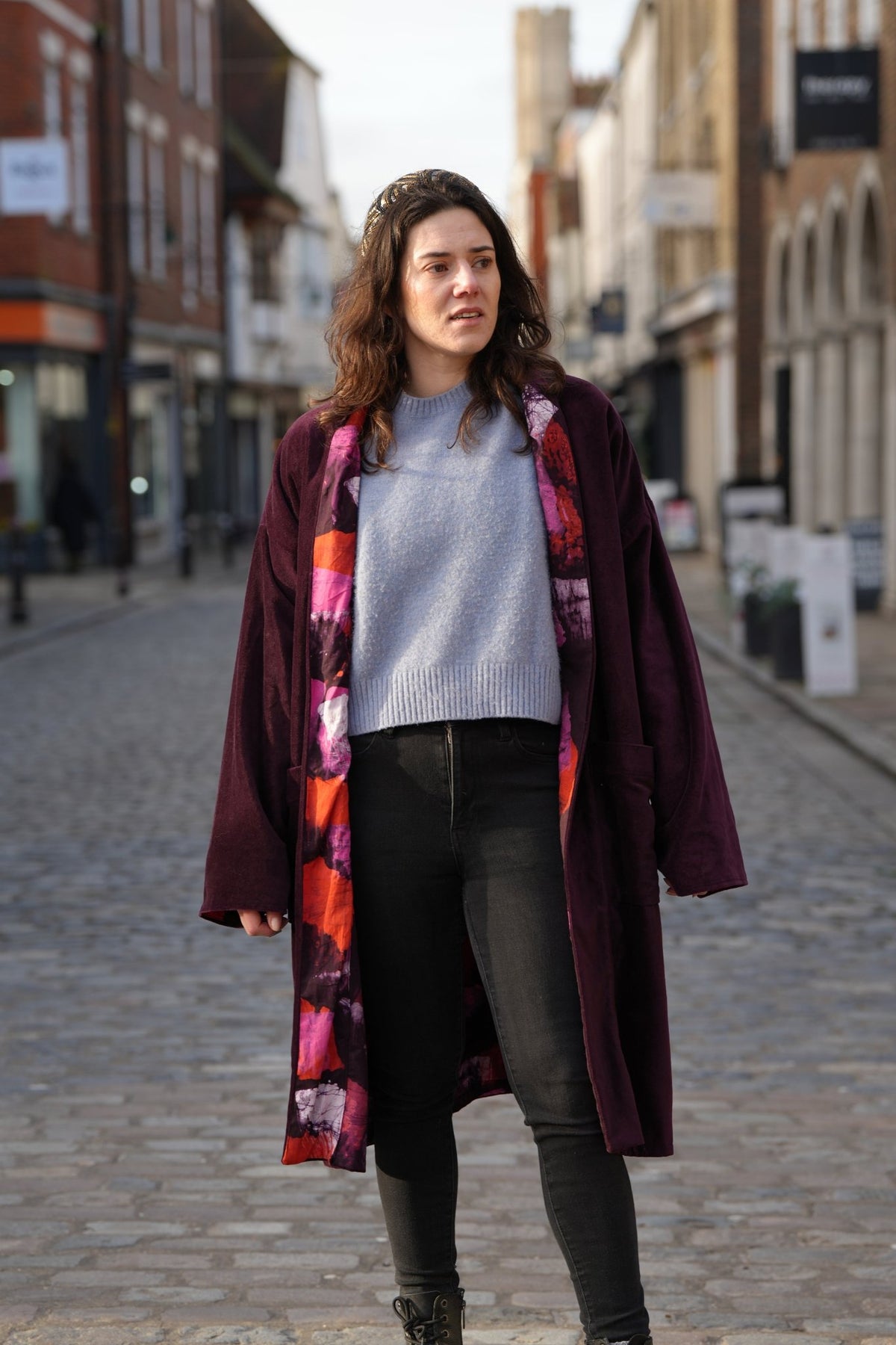 This fabulous handmade velvet coat in deep aubergine is reversible, featuring a gorgeous organic African hand painted cotton batik on the flip side. The batik design is utterly exquisite with complementary shades of aubergine, deep pink and burnt orange.